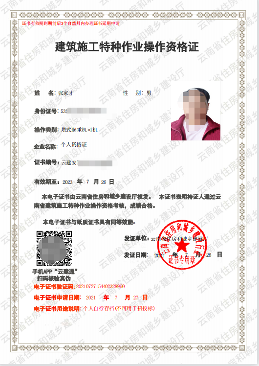 住建廳-塔式起重機(jī)司機(jī)(塔吊證)最新證書(shū)樣本