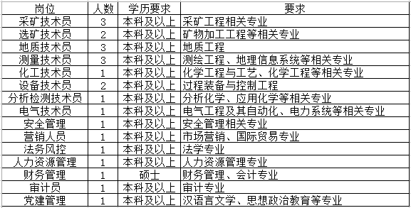 專業(yè)技術(shù)管理人才結(jié)構(gòu):采礦、礦物加工、資源勘查、測量、機械工程及其自動化、過程裝備與控制、電氣、儀表、自動化、企業(yè)管理、會計或財務(wù)管理、市場營銷、法律……等。