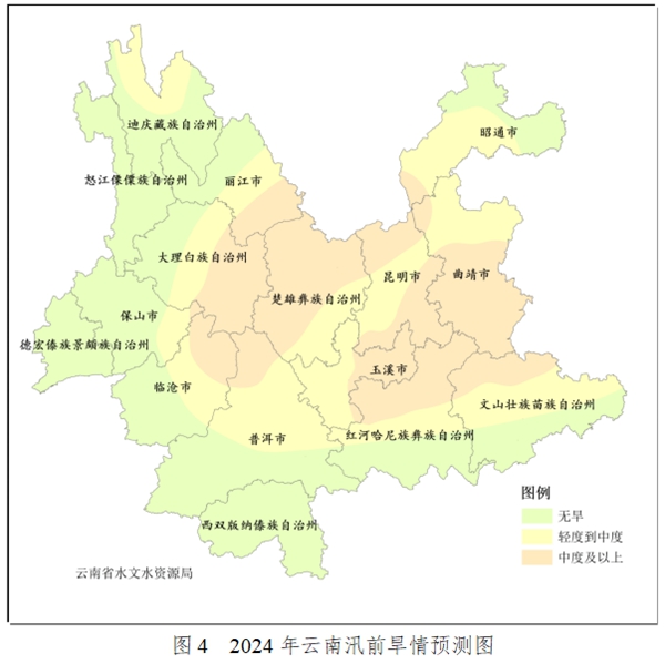 汛前尤其是4月至5月全省大部旱情偏重。據(jù)水文部門預(yù)測(cè),預(yù)計(jì)1月至5月全省主要江河來(lái)水整體偏少,全省部分中小河流可能斷流,汛前昆明市主城區(qū)、玉溪市紅塔區(qū)、楚雄州楚雄市、臨滄市臨翔區(qū)存在較大供水壓力。滇中大部、滇東北大部、滇東大部、滇西北東部和北部、滇西東部、滇南北部發(fā)生輕度至中度干旱的可能性較大,其中曲靖市中南部、文山州北部、紅河州北部、玉溪市東部、昆明市東南部和北部、昭通市西南部、楚雄州大部、普洱市北部、臨滄市東北部、大理州東南部、麗江市南部以及金沙江、紅河、瀾滄江干熱河谷地區(qū)可能發(fā)生中度及以上干旱(見(jiàn)圖4),抗旱形勢(shì)嚴(yán)峻。建議:密切監(jiān)測(cè)旱情動(dòng)態(tài),提前謀劃做好抗旱減災(zāi)準(zhǔn)備,提高抗旱保供能力,確保生活生產(chǎn)生態(tài)用水安全。
