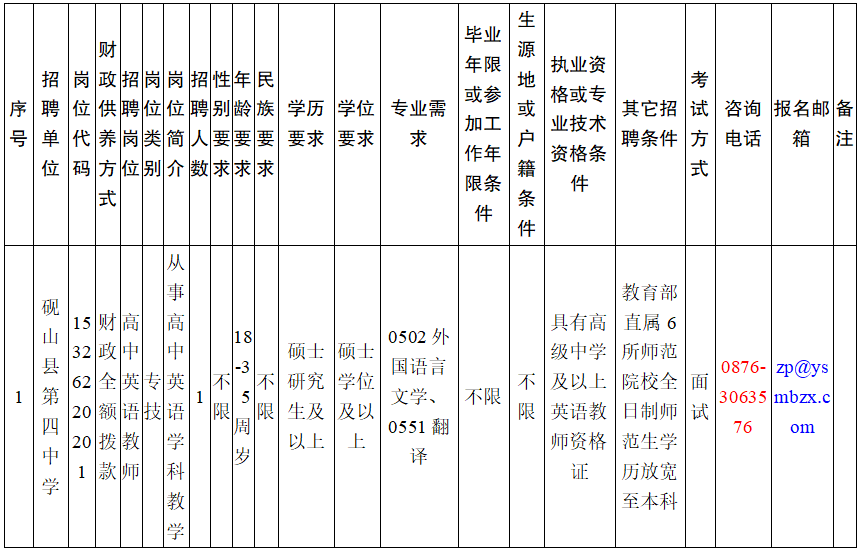 本次緊缺崗位招聘采取網(wǎng)絡(luò)報名或現(xiàn)場報名的方式進(jìn)行。網(wǎng)絡(luò)報名郵箱為:zp@ysmbzx.com,咨詢電話:0876-3063576,F(xiàn)場報名可到硯山縣第四中學(xué)進(jìn)行報名。
