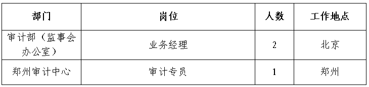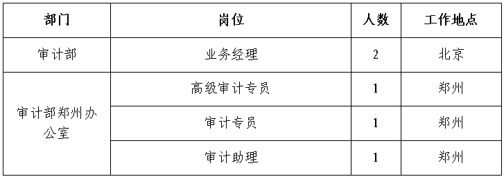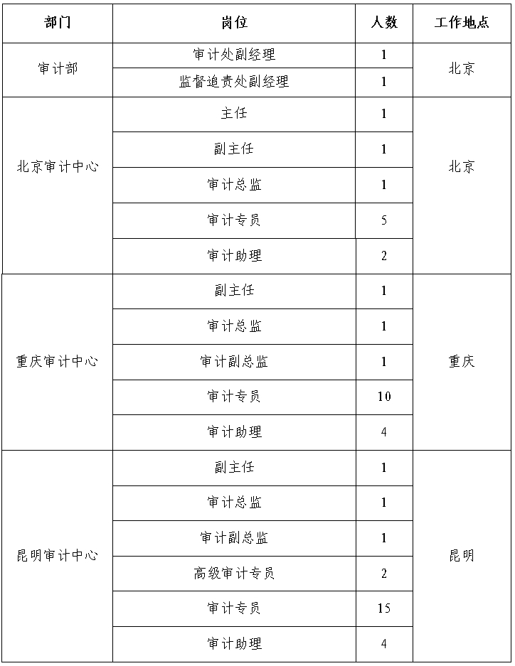 根據(jù)工作需要,經(jīng)研究決定,現(xiàn)面向社會公開招聘方式補(bǔ)充集團(tuán)總部、有關(guān)單位審計(jì)人員65人,F(xiàn)將有關(guān)事項(xiàng)公告如下: