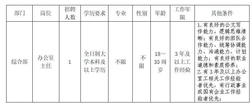 為加強(qiáng)人才隊(duì)伍建設(shè),優(yōu)化專技人員結(jié)構(gòu),結(jié)合公司工作實(shí)際,計(jì)劃公開(kāi)招聘辦公室主任一職,為確保公開(kāi)招聘工作順利進(jìn)行,現(xiàn)將有關(guān)事項(xiàng)公告如下: