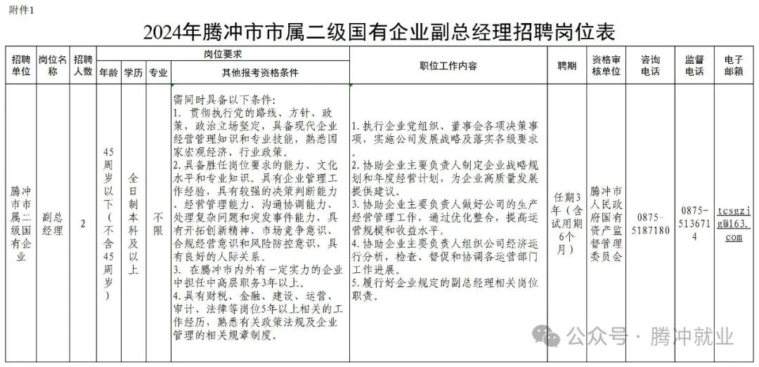 附件:1. 2024年騰沖市市屬二級國有企業(yè)副總經(jīng)理招聘崗位表