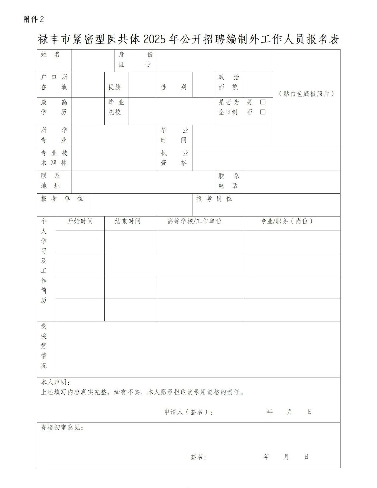 2. 祿豐市緊密型醫(yī)共體2025年公開招聘編制外工作人員報名表