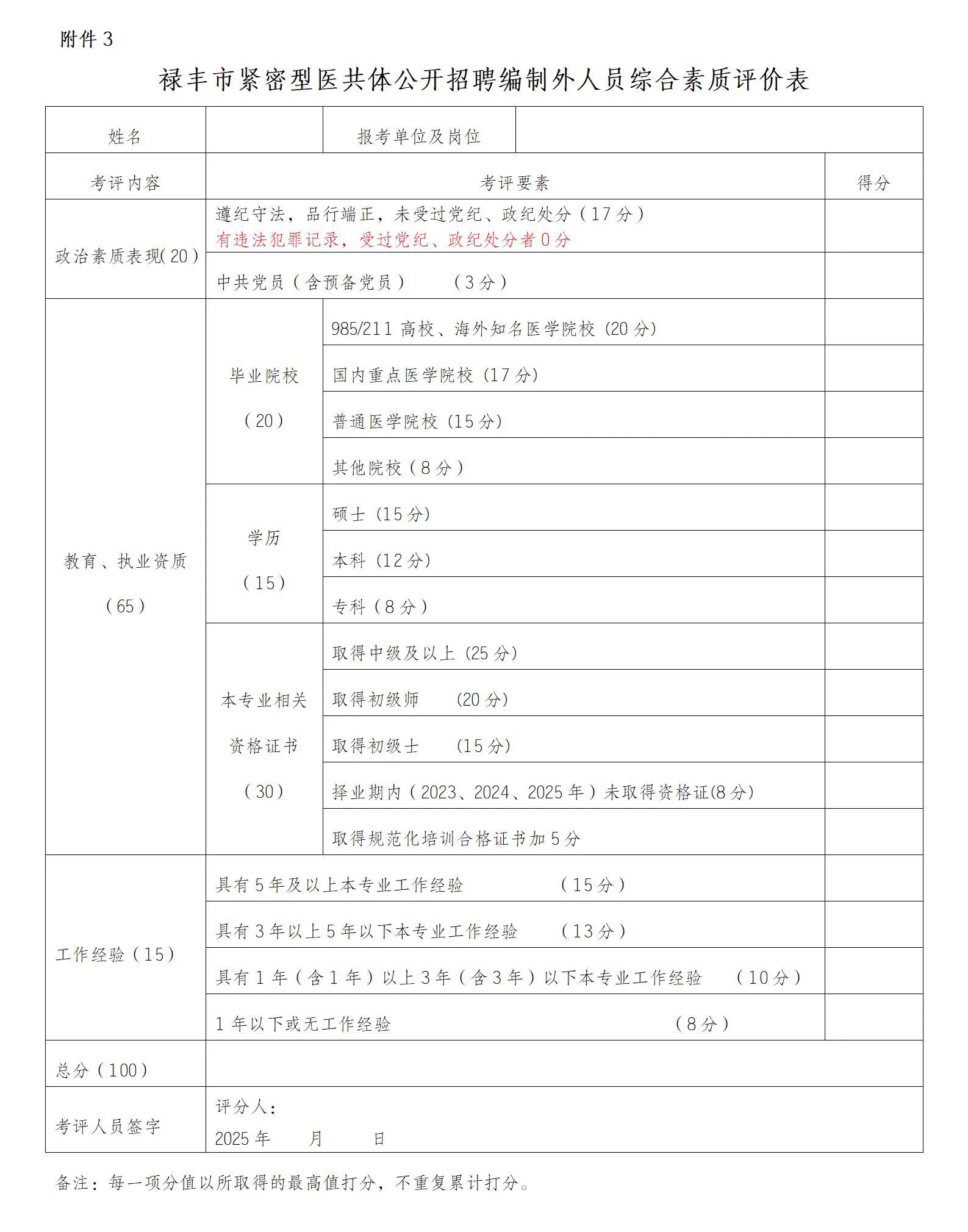 3.祿豐市緊密型醫(yī)共體公開招聘編制外人員綜合素質(zhì)評價表