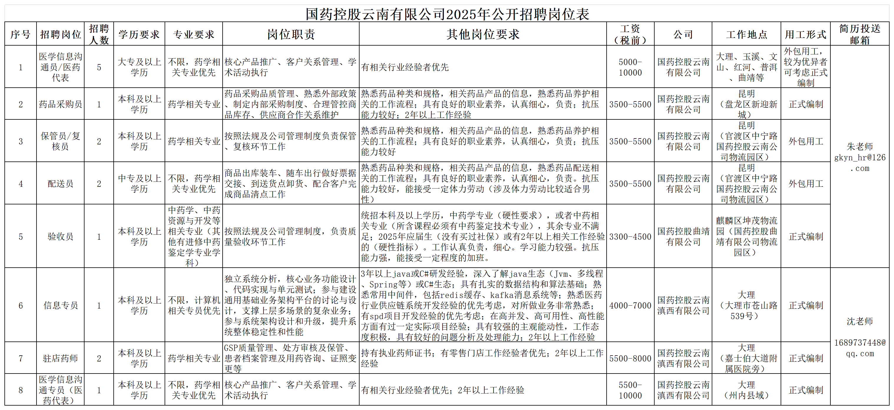 附件1:國藥控股云南有限公司2025年公開招聘崗位表