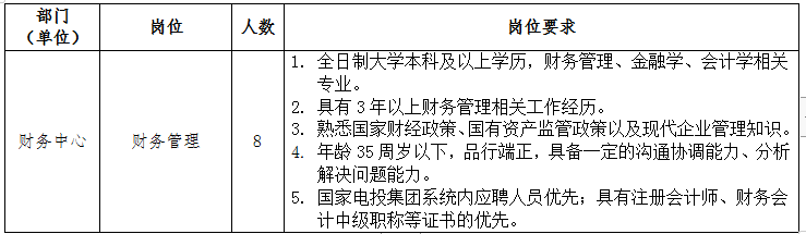 面向國家電投集團(tuán)系統(tǒng)內(nèi)、外招聘財(cái)務(wù)管理崗位人員8人。